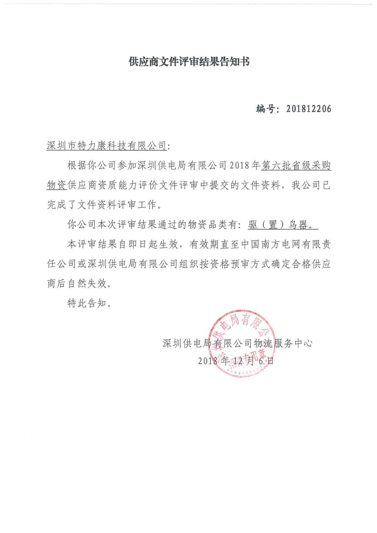 南方電網(wǎng)深圳供電有限公司2018年第六批驅(qū)(置)鳥器框架項(xiàng)目評(píng)審工作已結(jié)束,經(jīng)評(píng)審委員會(huì)評(píng)審,經(jīng)南網(wǎng)深圳電力公司招投標(biāo)領(lǐng)導(dǎo)小組批準(zhǔn),我司被確定為此次驅(qū)(置)鳥器框架中標(biāo)單位現(xiàn)將公告公示。
