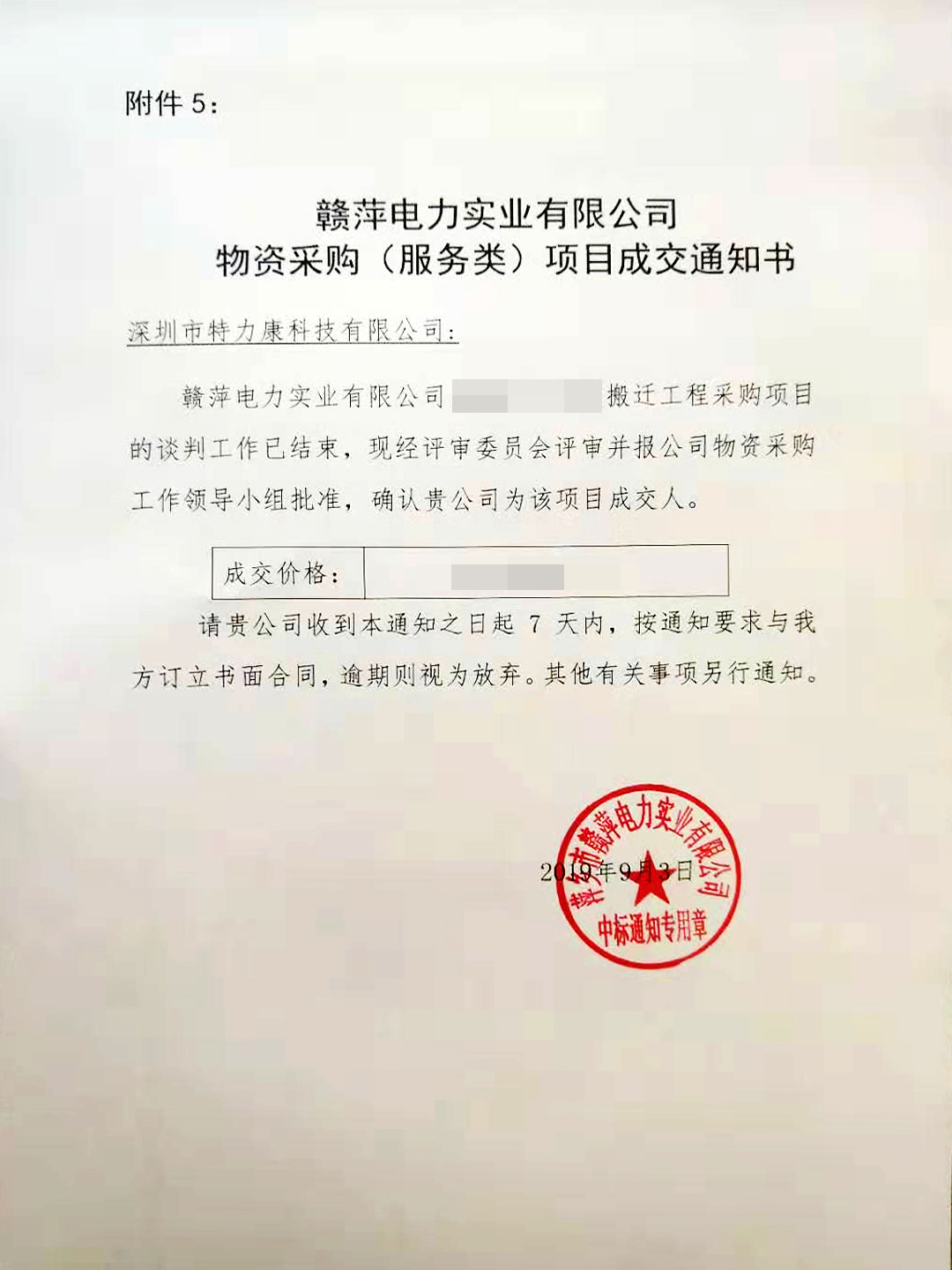 贛萍電力220KV線路搬遷工程采購項目談判工作已結(jié)束,經(jīng)招標(biāo)評審委員會評審,現(xiàn)確定我司以此次線路搬遷工程中標(biāo)單位。
