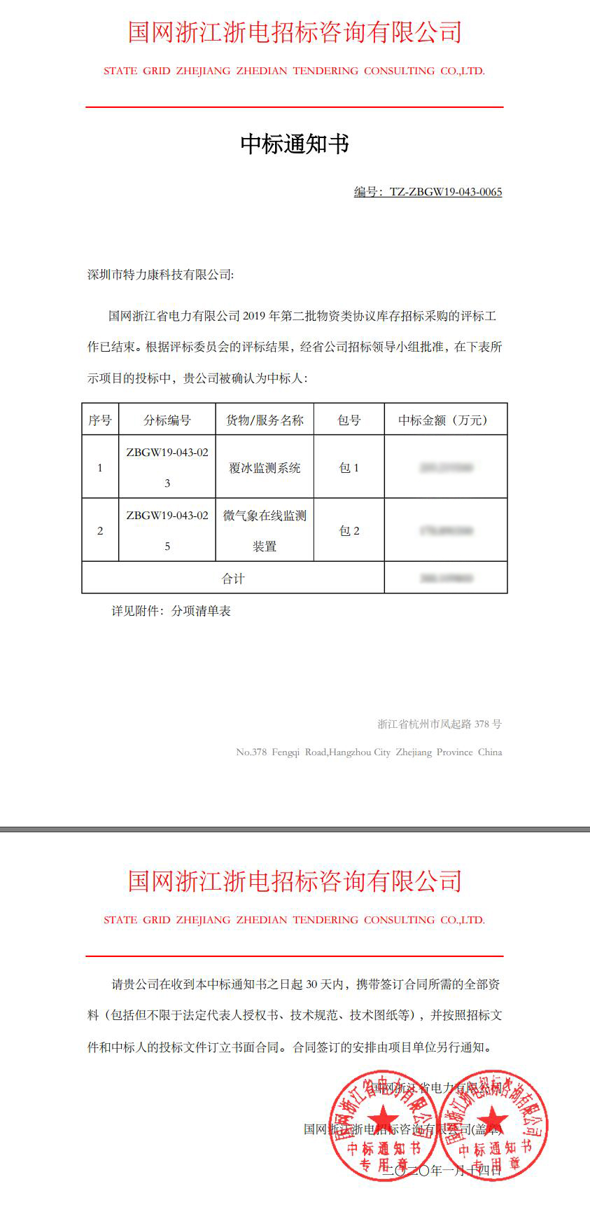 國網(wǎng)浙江省電力有限公司2019年第二批物資類協(xié)議庫存招標(biāo)采購的評標(biāo)工作已結(jié)束。根據(jù)評標(biāo)委員會的評標(biāo)結(jié)果,經(jīng)省公司招標(biāo)領(lǐng)導(dǎo)小組批準(zhǔn),我司(深圳市特力康科技有限公司)中標(biāo)ZBGW19-043-023覆冰監(jiān)測系統(tǒng)包1及ZBGW19-043-025微氣象在線監(jiān)測包2兩個標(biāo)包,現(xiàn)附中標(biāo)通知書如下: