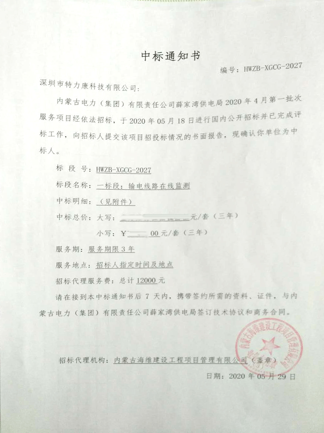 內(nèi)蒙古電力(集團)有限責(zé)任公司薛家灣供電局2020年4月第一批次服務(wù)項目(一標段:輸電線路在線監(jiān)測)經(jīng)依法招標,于2020年05月18日進行國內(nèi)公開招標并已完成評標工作,向招標人提交該項目招投標情況的書面報告,現(xiàn)確認我司(深圳市特力康科技有限公司)為中標人。特發(fā)中標通知書,如下:
