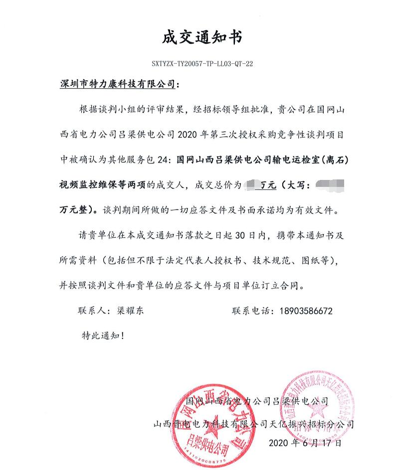 根據(jù)談判小組的評審結(jié)果,經(jīng)招標領(lǐng)導(dǎo)組批準,我司(深圳市特力康科技有限公司)在國網(wǎng)山西省電力公司呂梁供電公司2020年第三次授權(quán)采購競爭性談判項目中被確認為其他服務(wù)包24:國網(wǎng)山西呂梁供電公司輸電運檢室(離石)視頻監(jiān)控維保等兩項的成交人,現(xiàn)中標通知以下: