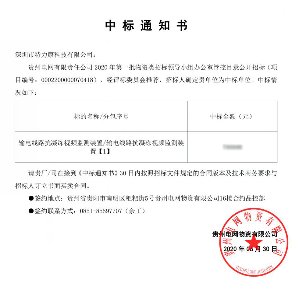 我司(深圳市特力康科技有限公司)在投標(biāo)貴州電網(wǎng)有限責(zé)任公司2020年第一批物資類招標(biāo)領(lǐng)導(dǎo)小組辦公室管控目錄公開招標(biāo)(項(xiàng)目編號(hào): 0000000070418) 中輸電線路抗凝凍視頻監(jiān)測(cè)裝置標(biāo)包,經(jīng)評(píng)標(biāo)委員會(huì)推薦,招標(biāo)人確定我司為中標(biāo)單位。特發(fā)中標(biāo)通知書,如下:
