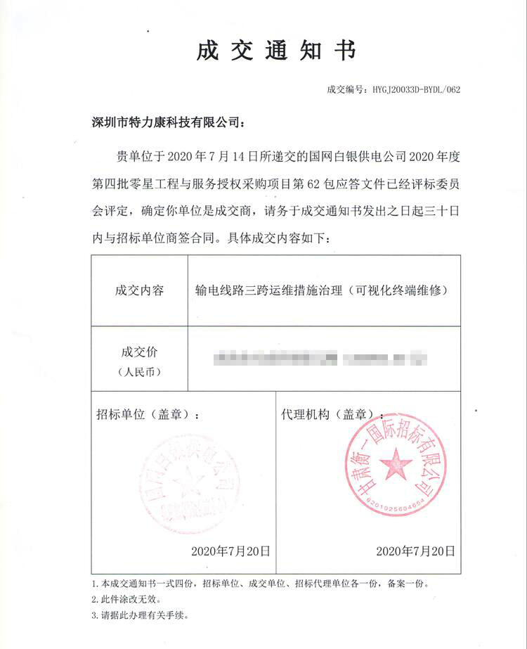 我司于2020年7月14日參加了國網(wǎng)白銀供電公司2020年度第四批零星工程與服務授權采購項目第62包輸電線路三跨運維措施治理(可視化終端維修)的投標工作,所遞交的應答文件經(jīng)評標委員會評定,確定我司(深圳市特力康科技有限公司)是成交商,具體成交內(nèi)容如下: