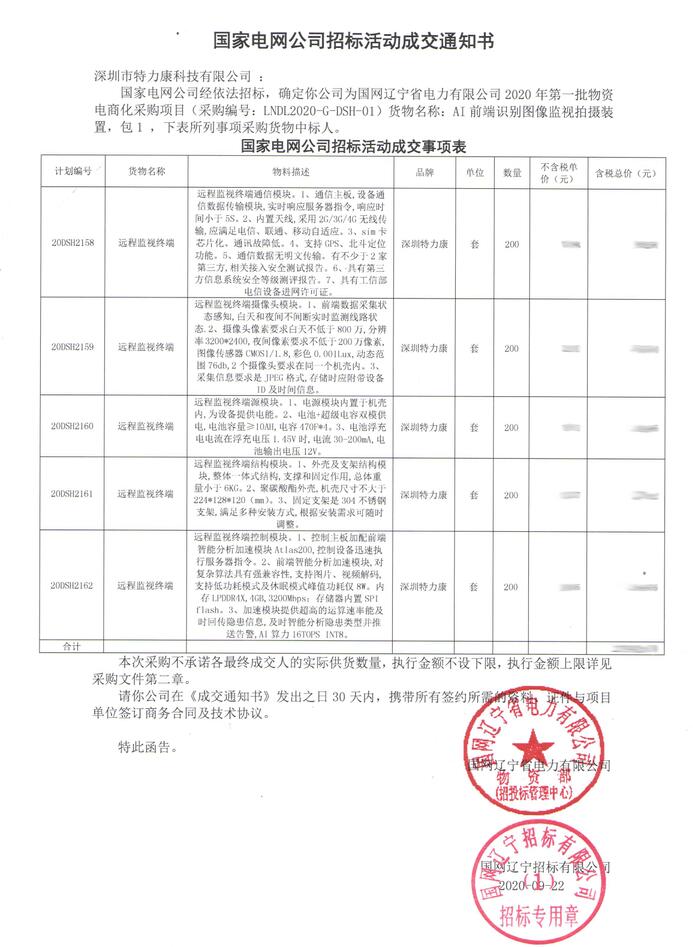 國(guó)家電網(wǎng)公司經(jīng)依法招標(biāo),確定我司(深圳市特力康科技有限公司)為國(guó)網(wǎng)遼寧省電力有限公司2020年第一批物資電商化采購(gòu)項(xiàng)目(采購(gòu)編號(hào): LNDL2020-G- -DSH-01)貨物名稱(chēng): AI 前端識(shí)別圖像監(jiān)視拍攝裝置,包1,下表所列事項(xiàng)采購(gòu)貨物中標(biāo)人(附件如下)。