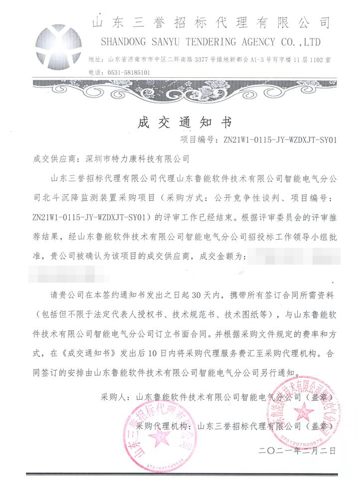 本次山東三譽(yù)招標(biāo)代理有限公司代理山東魯能軟件技術(shù)有限公司智能電氣分公司北斗沉降監(jiān)測(cè)裝置采購項(xiàng)目(采購方式:公開競(jìng)爭(zhēng)性談判、項(xiàng)目編號(hào):ZN21W1-0115-JY-WZDXJT-SY01)的評(píng)審工作已經(jīng)結(jié)束。根據(jù)評(píng)審委員會(huì)的評(píng)審?fù)扑]結(jié)果,經(jīng)山東魯能軟件技術(shù)有限公司智能電氣分公司招投標(biāo)工作領(lǐng)導(dǎo)小組批準(zhǔn),我司(深圳市特力康科技有限公司)被確認(rèn)為該項(xiàng)目的成交供應(yīng)商,成交通知如下: