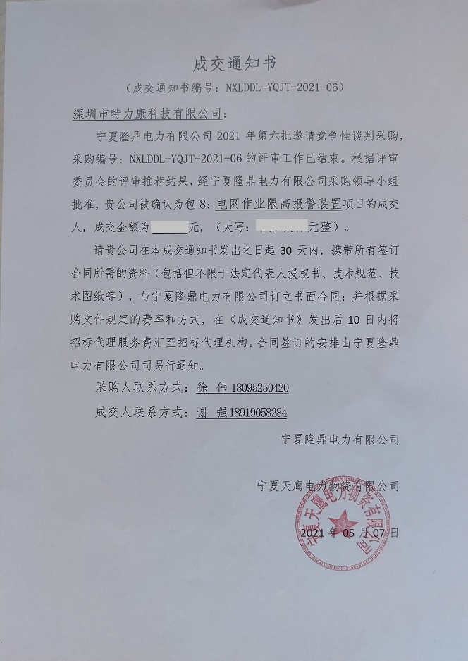 寧夏隆鼎電力有限公司2021年第六批邀請競爭性談判采購,采購編號: NXLDDL-YQJT -2021-06的評審工作已結(jié)束。根據(jù)評審委員會的評審?fù)扑]結(jié)果,經(jīng)寧夏隆鼎電力有限公司采購領(lǐng)導(dǎo)小組批準(zhǔn),我司被確認為包8:電網(wǎng)作業(yè)限高報警裝置項目的成交人,中標(biāo)通知如下: