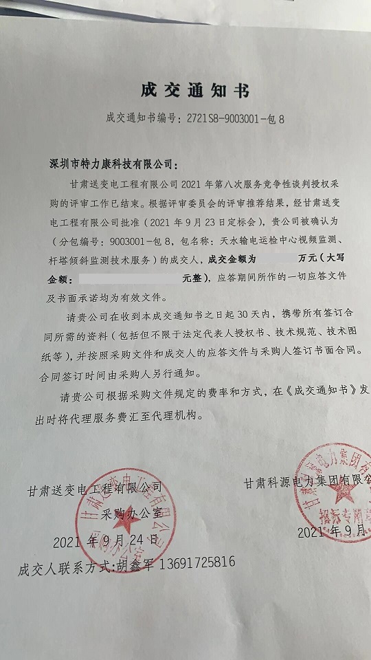 甘肅送變電工程有限公司2021年第八次服務(wù)競爭性談判授權(quán)采購的評審工作已結(jié)束。根據(jù)評審委員會的評審?fù)扑]結(jié)果,經(jīng)甘肅送變電工程有限公司批準(zhǔn)(2021 年9月23日定標(biāo)會),貴公司被確認(rèn)為(分包編號: 9003001-包8, 包名稱:天水輸電運(yùn)檢中心視頻監(jiān)測、桿塔傾斜監(jiān)測技術(shù)服務(wù))的成交人,中標(biāo)通知如下: