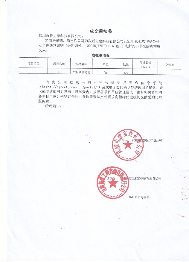 經(jīng)依法采購,確定我司為武威電建實(shí)業(yè)有限公司2021年第七次物資公開競爭性談判采購(采購編號(hào): 2021DJWZ07) 016包I下表所列事項(xiàng)采購貨物成交人。成交通知如下: